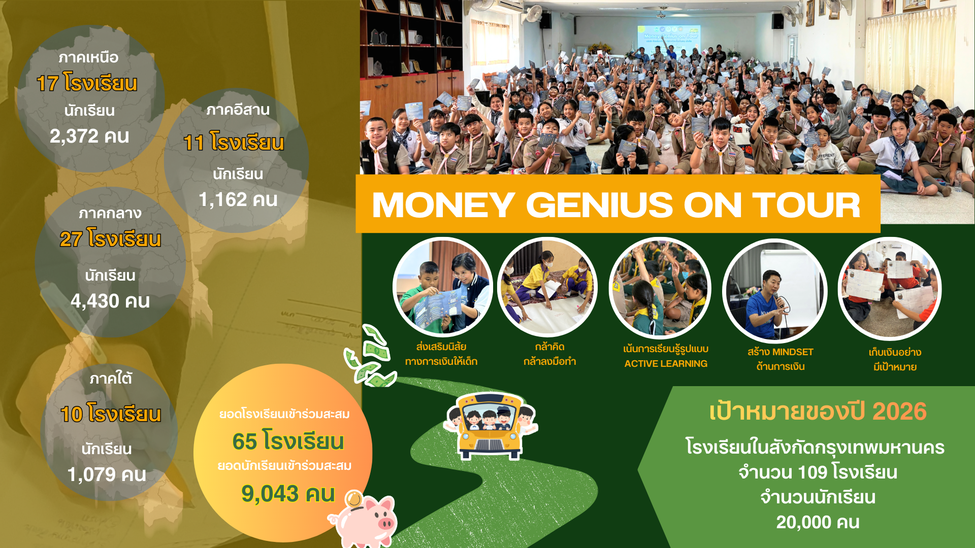 โครงการ Money Genius on Tour ได้สร้างการเปลี่ยนแปลงให้กับเยาวชนกว่า 9,000 คนทั่วประเทศ โดยช่วยให้เด็กเข้าใจเรื่องการเงินขั้นพื้นฐาน และสามารถนำแนวคิด “แบ่งเงินเป็นกระปุก” ไปใช้จริงในชีวิตประจำวัน